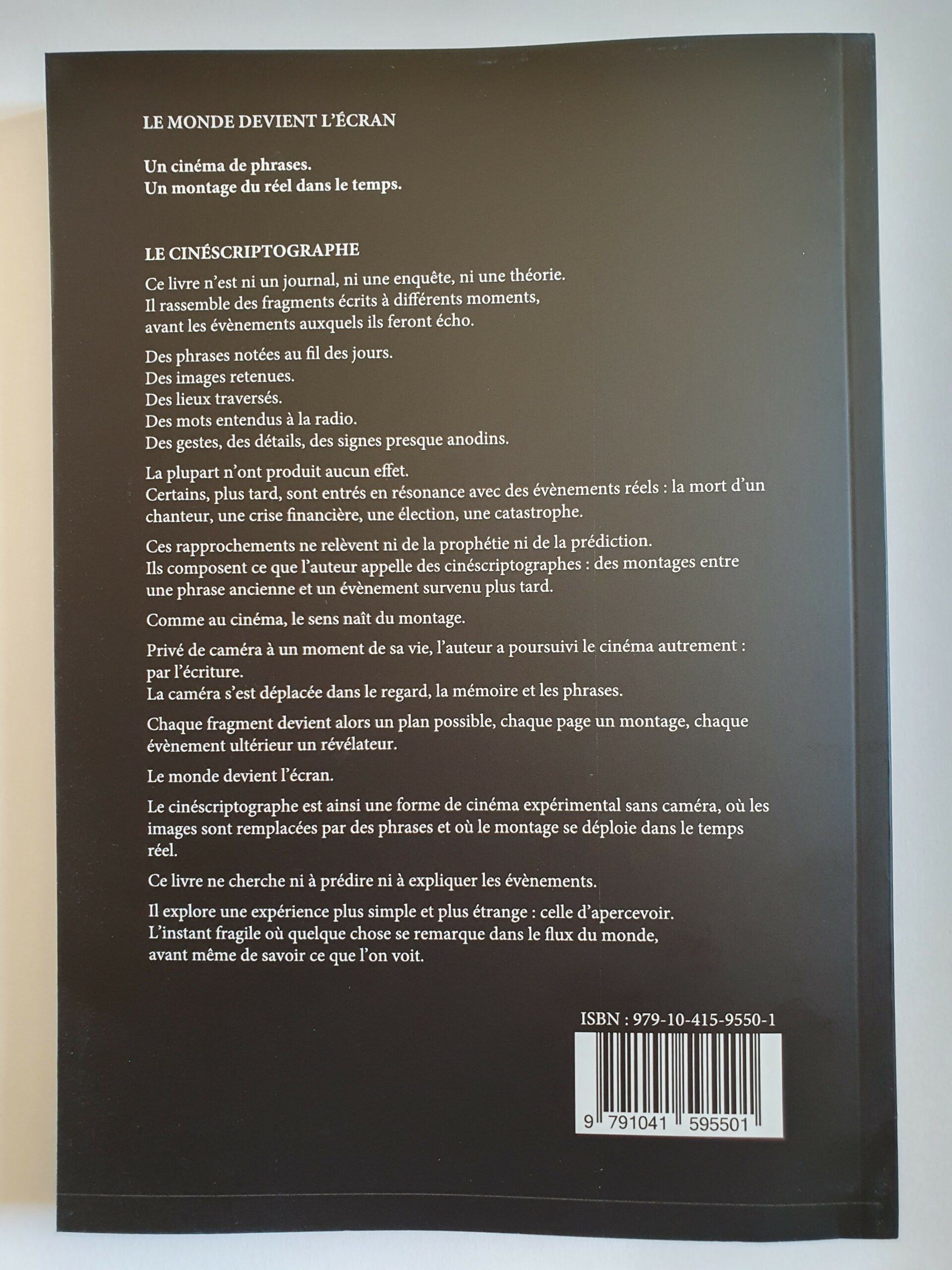 Le Cinéscriptographe — Cinéma sans caméra est un livre de fragments, où les phrases deviennent des images et le temps, un montage.